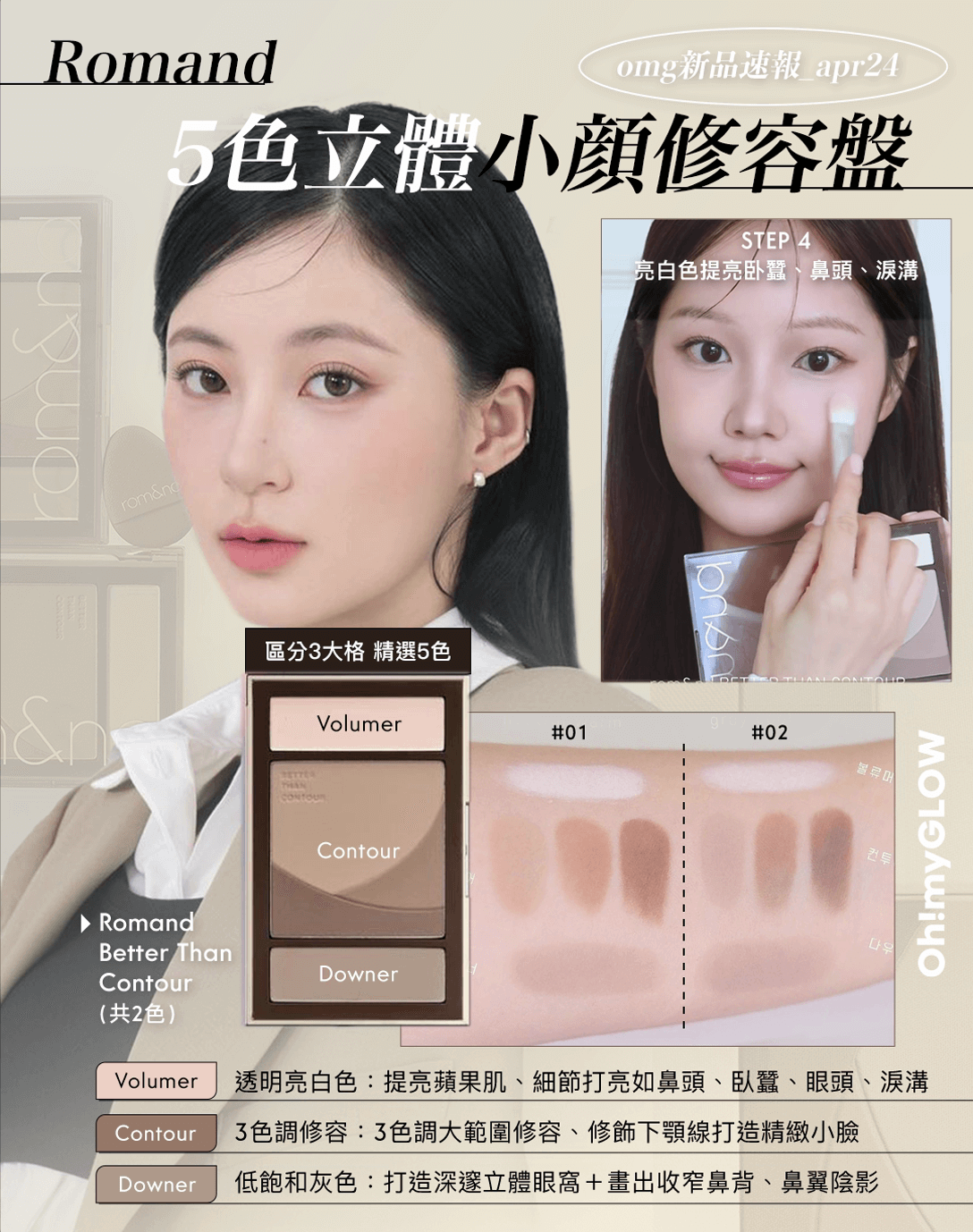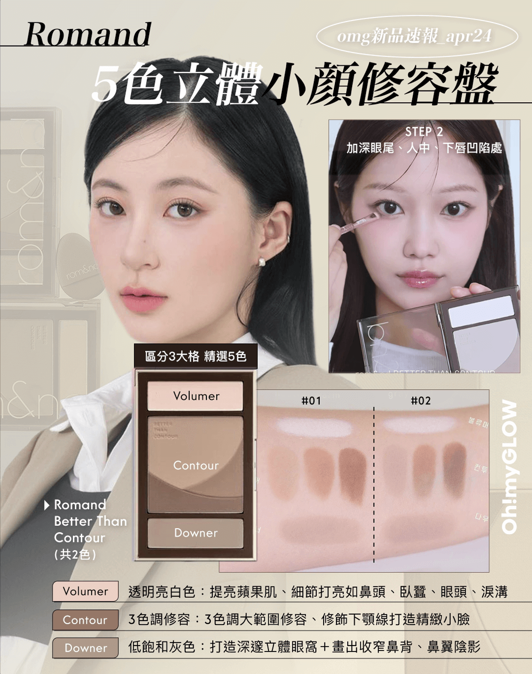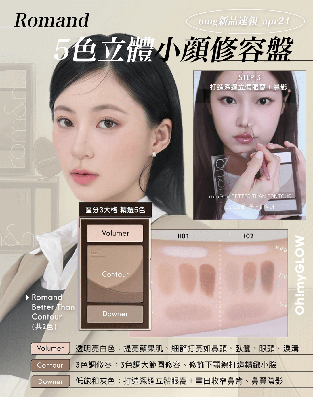 romand 另一修容新品~有齊冷暖色調,分成3大part 並精選5款必備陰影色,打造出臉部黃金比例!