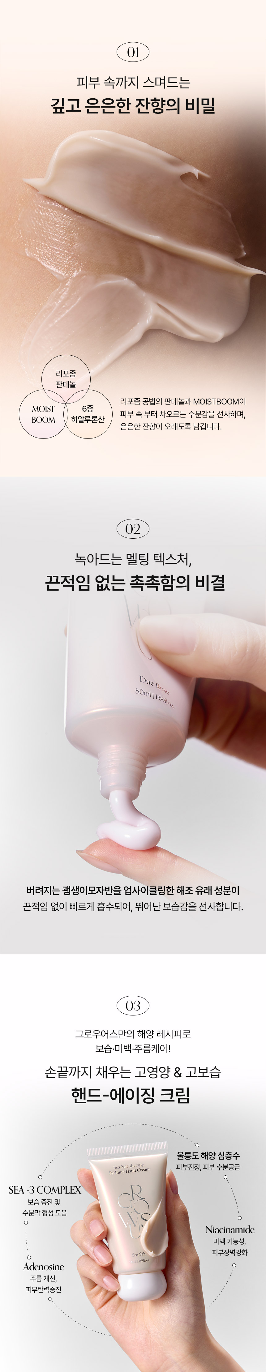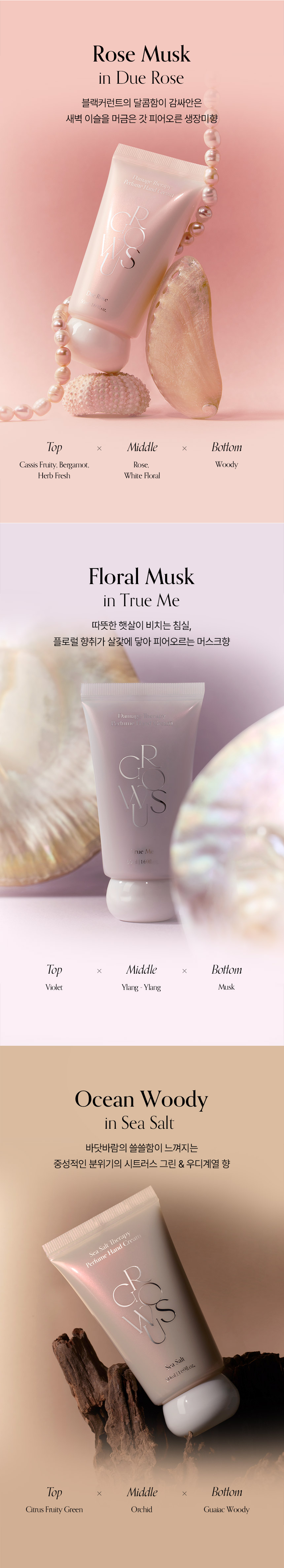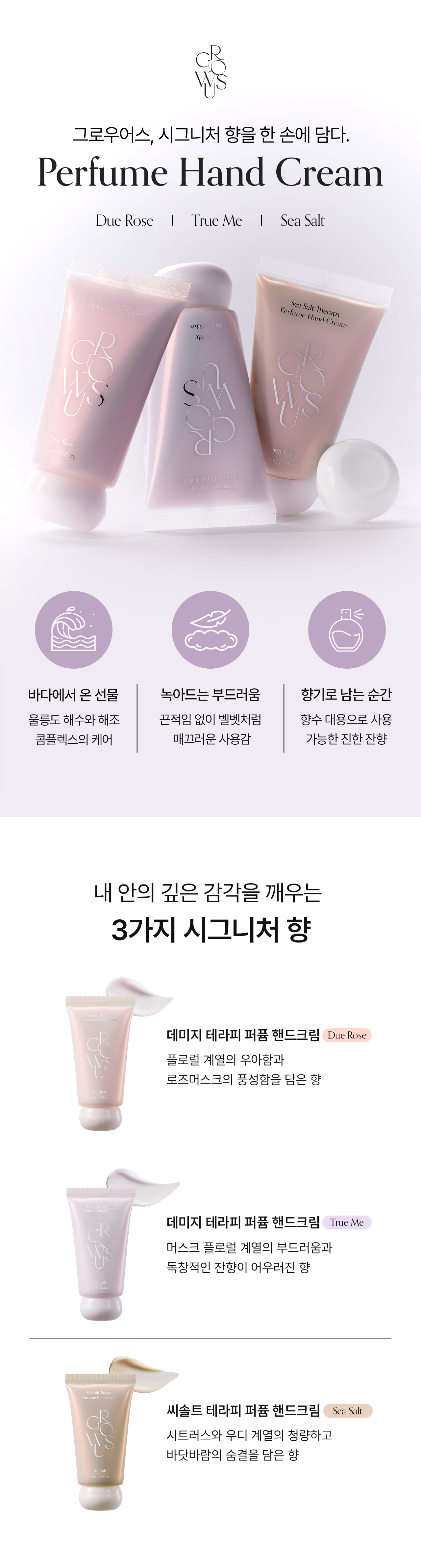 Growus Damage Therapy Perfume Hand Cream為你的雙手帶來奢華護理,結合三款標誌性香氛:Due Rose(優雅玫瑰)、True Me(麝香花香)、Sea Salt(海鹽清新),讓日常護手體驗升華為感官享受。