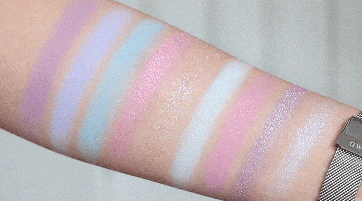 天藍色和粉紫色是這盤眼影的主調,兩個色調的配合形成了一個十分夢幻的眼影盤,讓人聯想到棉花糖和獨角獸。眼影盤中有一顆Super Shock shadow、兩顆金屬色、五顆啞色和一顆閃粉眼影。