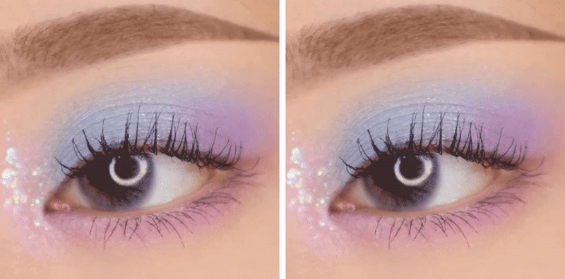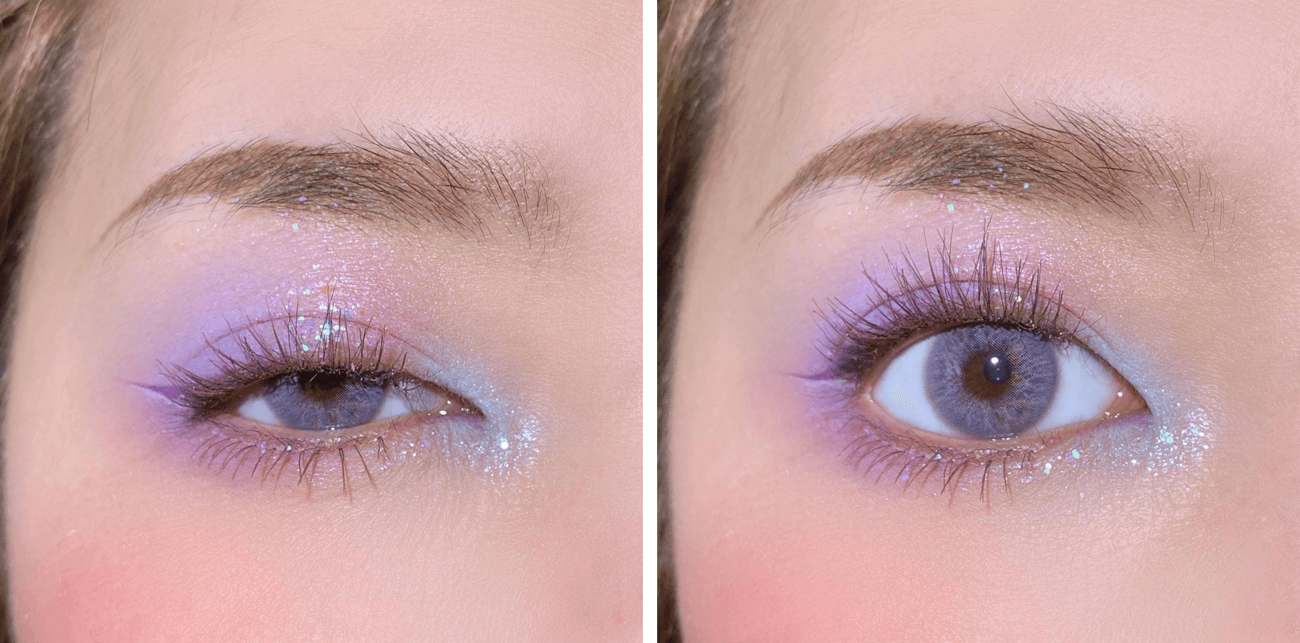 以天藍色和粉紫色做出暈染效果,再以大顆亮片在眼頭打亮,十分吸睛。