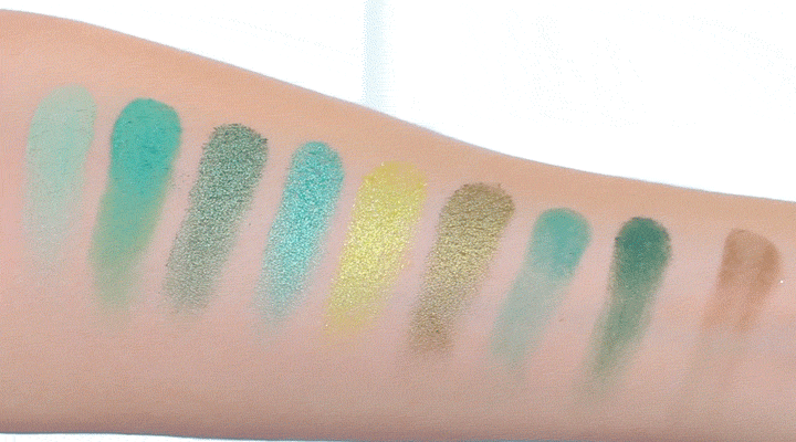 寶石綠9色眼影盤,包括5款啞光色調及4款金屬色調,粉質細滑,易推顯色。非日常色系,不建議新手試手,但對喜愛嘗試百變眼妝的你就不可以錯過,金色用在眼部中間位置作過度色簡直是畫龍點睛,令人驚艷。