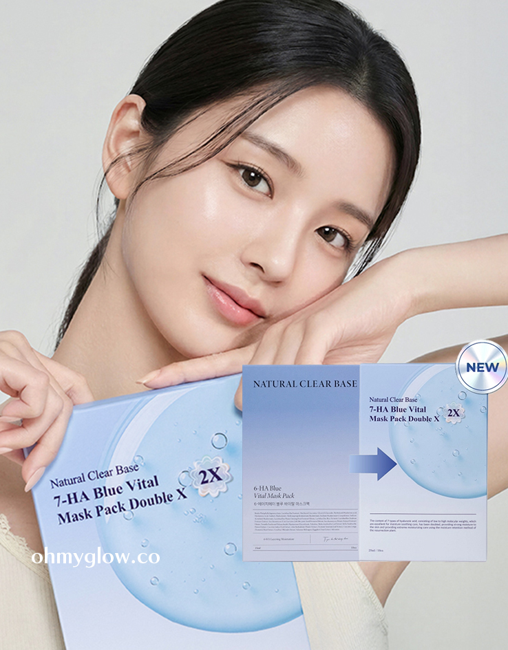 Natural Clear Base 最新升級版 7-HA Blue Vital Mask Pack Double X 一款主打密集補水、修護保濕屏障與舒緩的片狀面膜。由多種分子量透明質酸層層滲透補水,並添加多種天然與海洋來源精華,幫助改善乾燥、提升肌膚彈性與亮澤感。
