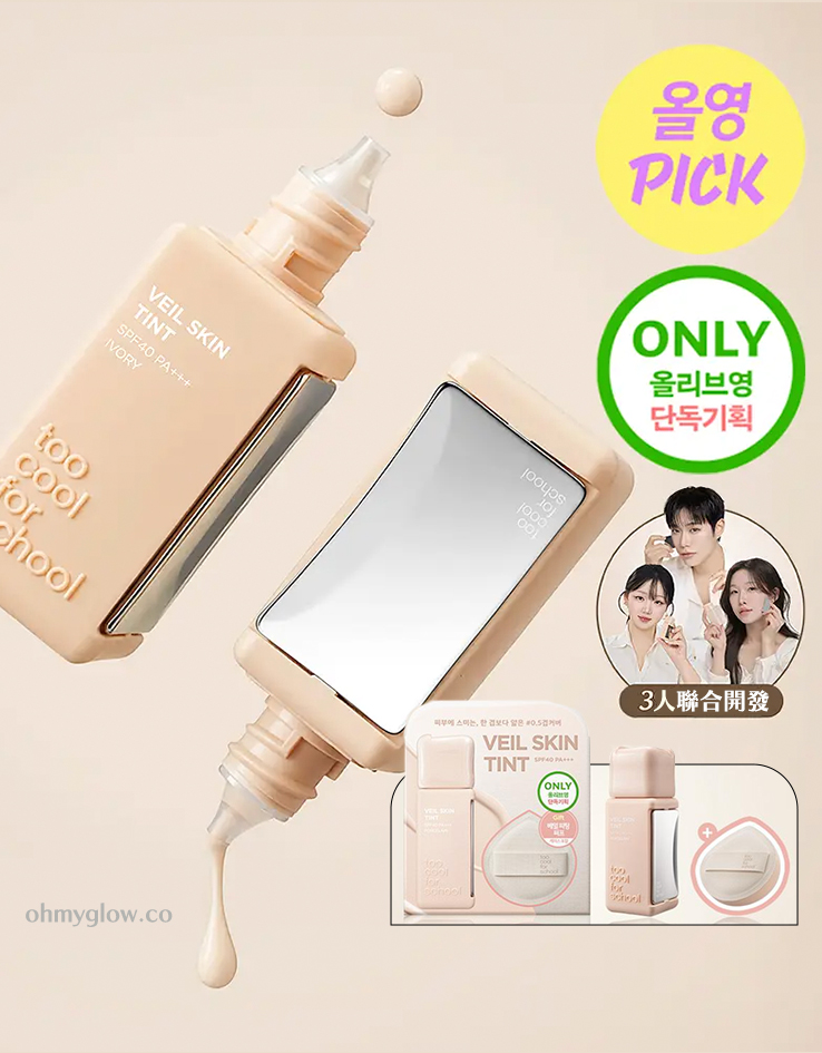 Too Cool For School 新出 Veil Skin Tint,與3位美妝達人(LeoJ, Arang, Toxin)聯手研發,採用超輕薄流質配方,帶來像 BB 般好推、像粉底般的完妝效果。提供薄透卻具修飾力的「0.5 層覆蓋cover」,呈現自然柔霧、平滑的肌膚質感,同時具備 SPF40 PA+++ 防曬功能。